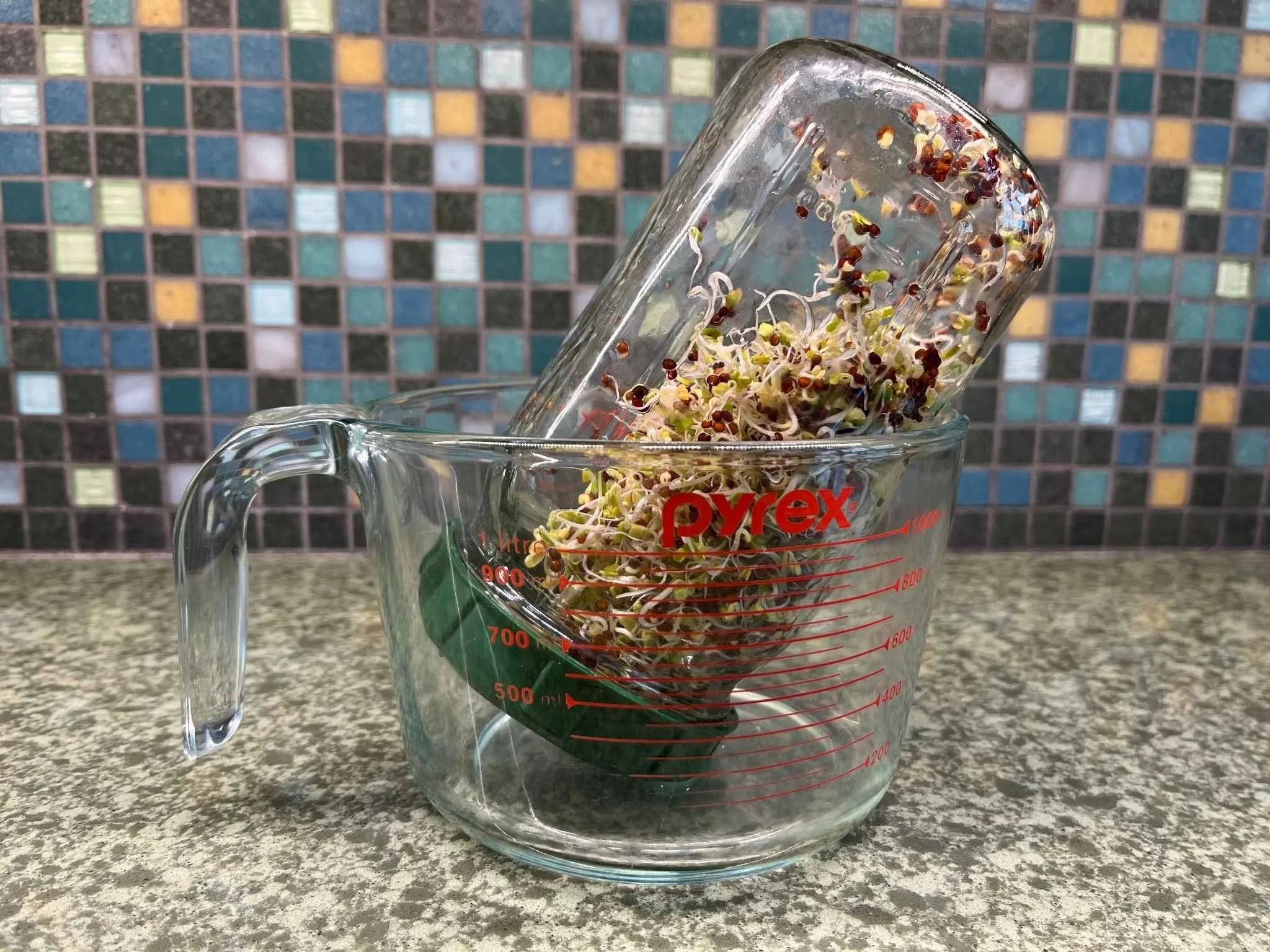 Broccoli sprouts draining after rinse.